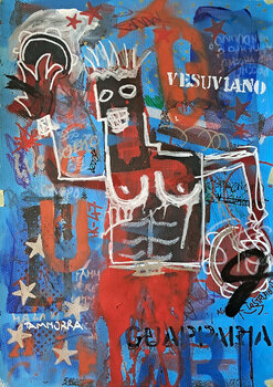 Con una tavolozza esplosiva di rossi lavici, blu elettrici e tratti bianchi essenziali, la figura centrale ricorda i graffiti urbani newyorkesi, ma il linguaggio è tutto mediterraneo: crudo, rituale, viscerale.