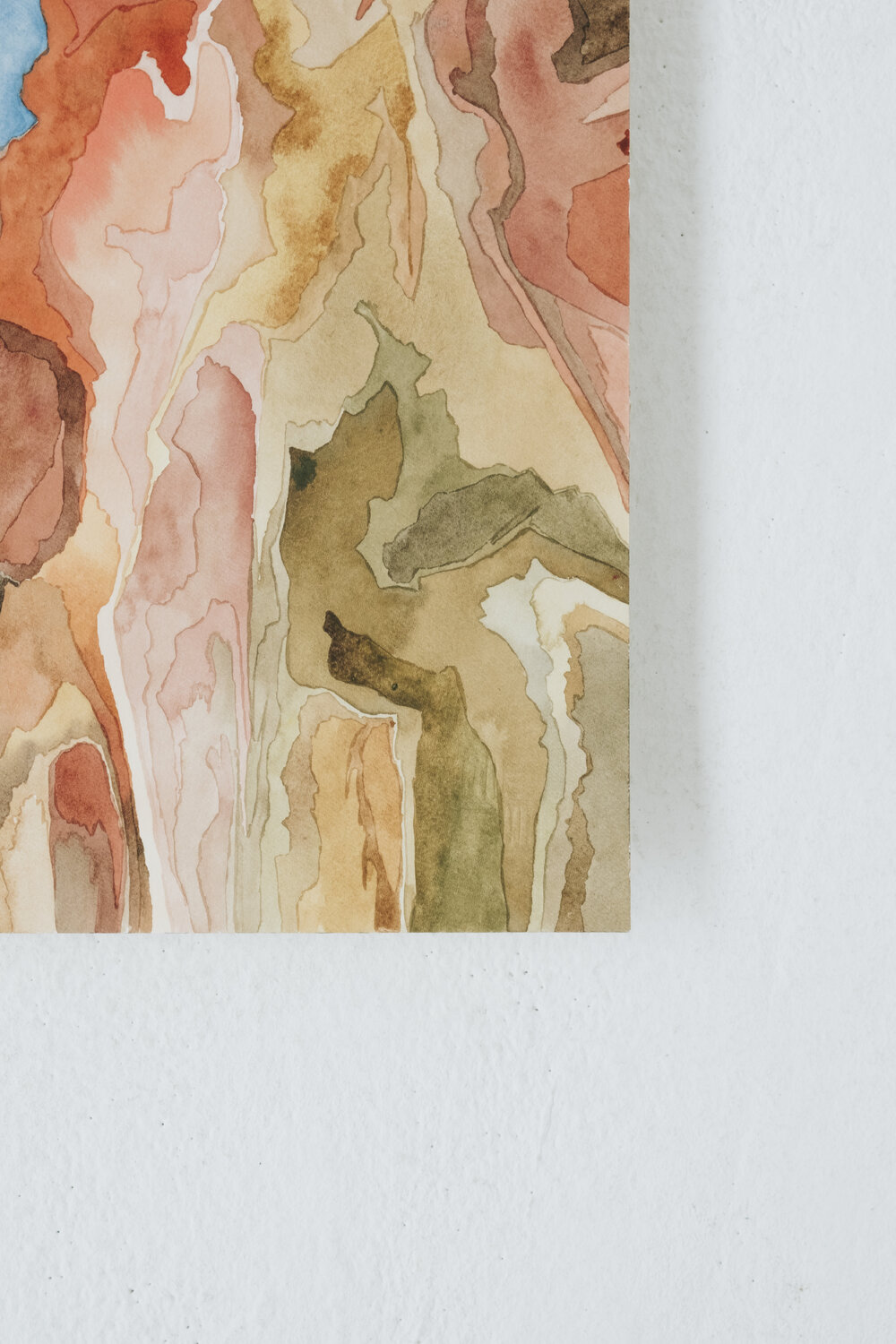 Con l'acquerello su carta, ho incanalato il mio amore per i boschi in quest'opera astratta, fondendo i toni caldi della terra contro un vasto cielo azzurro. Volevo evocare l'energia grezza degli elementi naturali che si fondono e si trasformano. Quest'opera conferisce una vitalità potente e radicata a qualsiasi spazio, invitando chi la osserva a sentirsi in contatto con il flusso mutevole della vita e con la bellezza racchiusa nel caos.