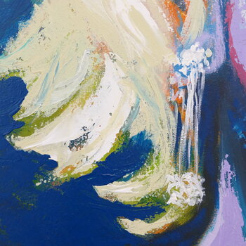 La palette di colori spazia tra blu e viola freddi, completati da accenti caldi che conferiscono profondità ed espressività al volto. Le pennellate visibili e le sottili stratificazioni rivelano volutamente il processo pittorico e donano all'immagine un'atmosfera… moderna e vibrante.