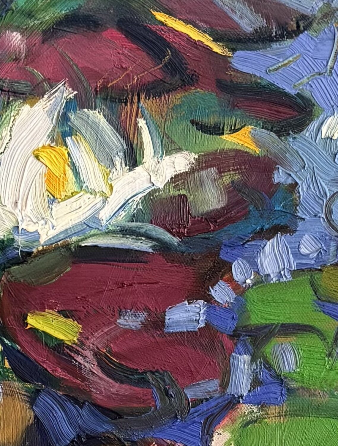 Foglie e fiori fluttuanti sembrano fluttuare serenamente sulla superficie dell'acqua. Eppure, sotto la quiete della scena, si percepisce il movimento e il gioco di luci. Un momento tra calma e vitalità, fugace ma intenso.