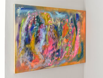 Dipinto acrilico moderno (dimensioni: 100 x 140 x 4,5 cm). Medium: acrilico e inchiostro su lino. Il dipinto è firmato sul retro, all'opera è allegato un certificato di autenticità. È pronto per essere appeso.