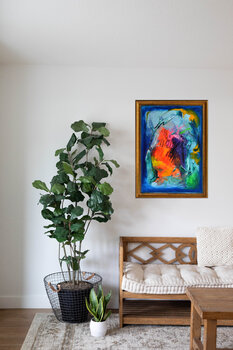 Water World I è un'opera d'arte astratta che evoca il mare e la biodiversità. La cornice dorata fa parte dell'opera d'arte e ricorda la street art.