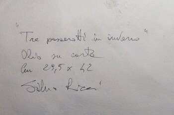"Tre passerotti in inverno", fa parte di un ciclo dedicato a piccoli volatili durante l'inverno, in difficoltà a procurarsi il cibo nelle giornate più fredde . Per accentuare l'effetto del freddo pungente ho accentuato i colori freddi della vegetazione, verde e giallo limone, in contrasto con i colori caldi del piumaggio.