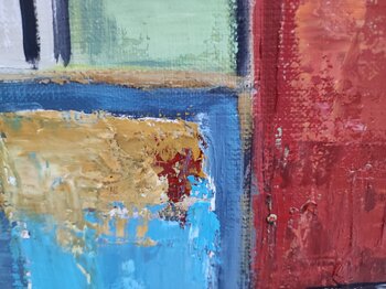 Una tavolozza colorata con una predominanza di verde e blu per questo laboratorio con un materiale sempre presente e colori che vibrano con il susseguirsi degli strati sulla tela. L'artista ci immerge nel suo universo, condivide parte della sua intimità con i dipinti.