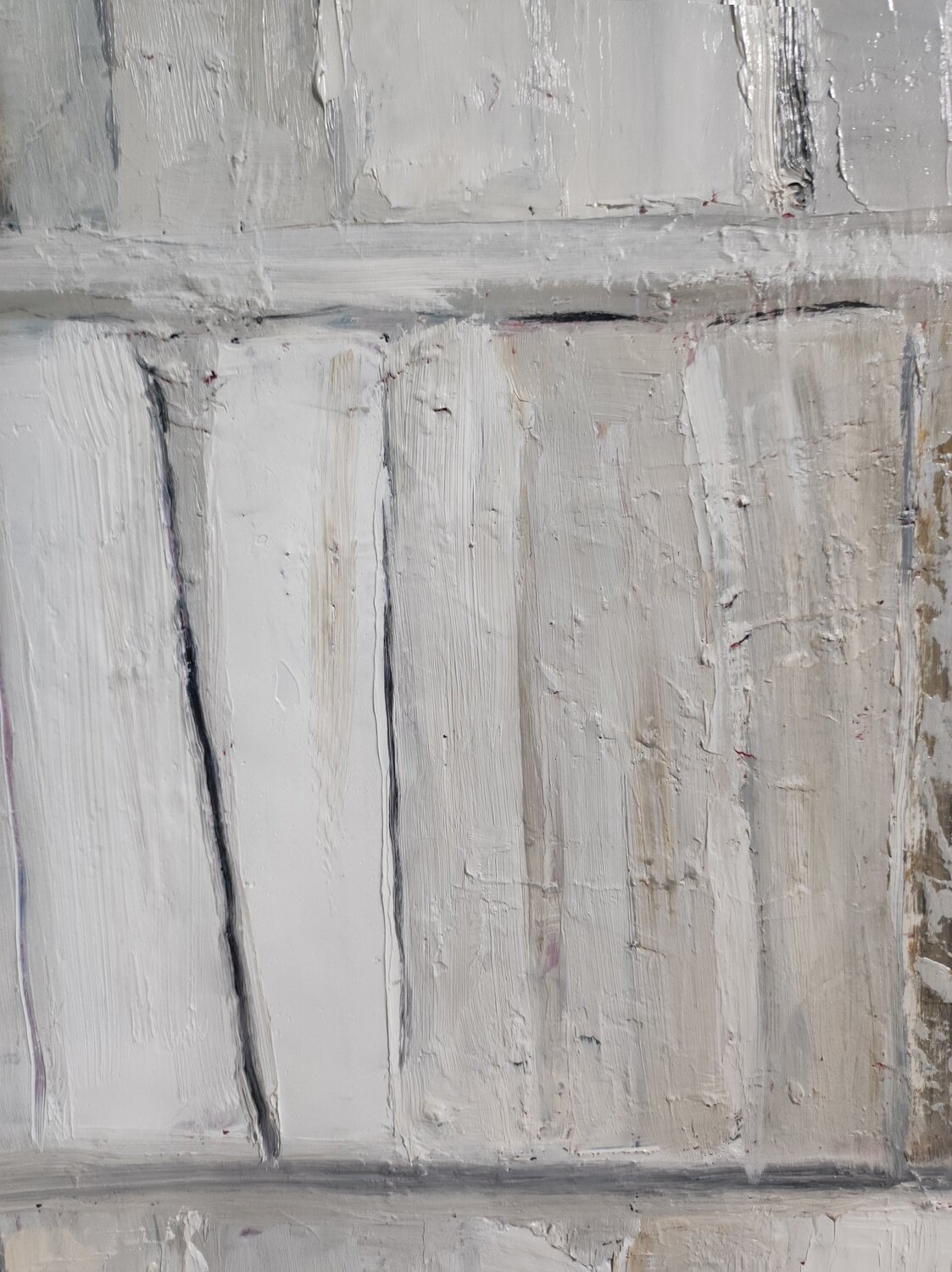 Lavorati in bianco e nero, questi libri bianchi e grigi conservati in una biblioteca, ci invitano a immergerci nell'immaginazione. Lavorato ad olio e con un coltello, il soggetto ha finito per scomparire a favore dell'astrazione. I diversi bianchi più o meno ocra o grigi danno volume ai libri; il materiale è fornito dagli strati successivi.