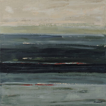 Questo olio su tela di Sophie Dumont evoca le profonde e mutevoli variazioni della Côte de Nacre. Gli strati orizzontali, lavorati in successive sovrapposizioni, rivelano sfumature di smeraldo, blu intenso e grigio minerale, punteggiate da sottili tracce di rosso scuro che vibrano sulla superficie.