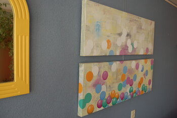 Quest'opera d'arte comprende due tele ciascuna di 120 × 40 cm. Quindi la dimensione totale dell'immagine è 120 × 80 cm, ma sono progettate per essere appese a circa 5-10 cm di distanza, come mostrato nelle immagini aggiuntive, per dare l'illusione che le palline cadano da una tela all'altra, e raccogliendo in fondo. Tutti i bordi sono verniciati in modo da poter essere facilmente appesi senza cornici.