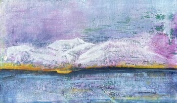 Questa immagine apre una serie in tre parti dedicata ai paesaggi svizzeri. In delicati strati di colore e texture, si dispiega una scena tranquilla di lago, orizzonte e montagne. Cielo e acqua sembrano fondersi, trasportati da tenui tonalità di blu, rosa e viola che trasmettono pace e vastità. Il paesaggio non è localizzato in un luogo specifico, ma piuttosto concepito come un ricordo o una sensazione: un momento tra luce, tempo atmosferico e stato… d'animo interiore.