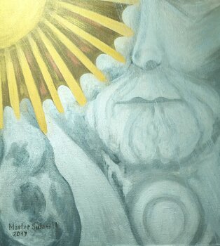 Volto. Silenzio e luce. Il dipinto è realizzato con acrilico su tela. L'immagine rappresenta l'Onnipotente che vede tutto ciò che accade quando sembra che i suoi occhi siano chiusi. Ci sono angeli nella parte inferiore del dipinto.