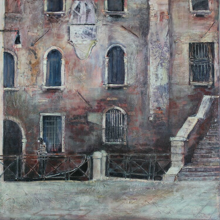 Le trame fatiscenti e le morbide tonalità calde di una facciata veneziana sono sapientemente create con collage e acrilico. I tenui rosa e rossi catturano questa scena tipica. Una gondola può essere vista nell'angolo sinistro del dipinto che aggiunge atmosfera. Il dipinto è verniciato per proteggere dalla luce e dalla polvere.