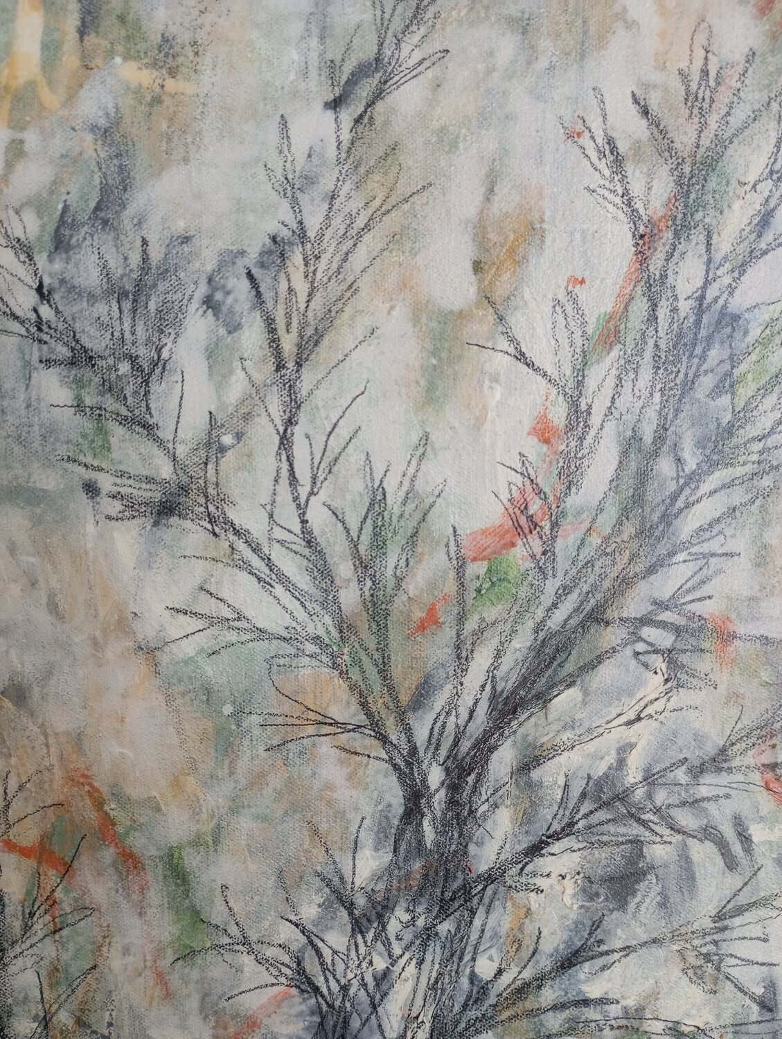 In quest'opera, ho canalizzato l'energia sottile tra la vita fredda e quella emergente, utilizzando acrilico e grafite per catturare questa dualità astratta. Volevo esprimere come la natura si reinventa silenziosamente, con linee che culminano in un movimento quasi poetico. Averla in casa evocherà una calma vibrante che ispira rinnovamento costante e forza silenziosa.