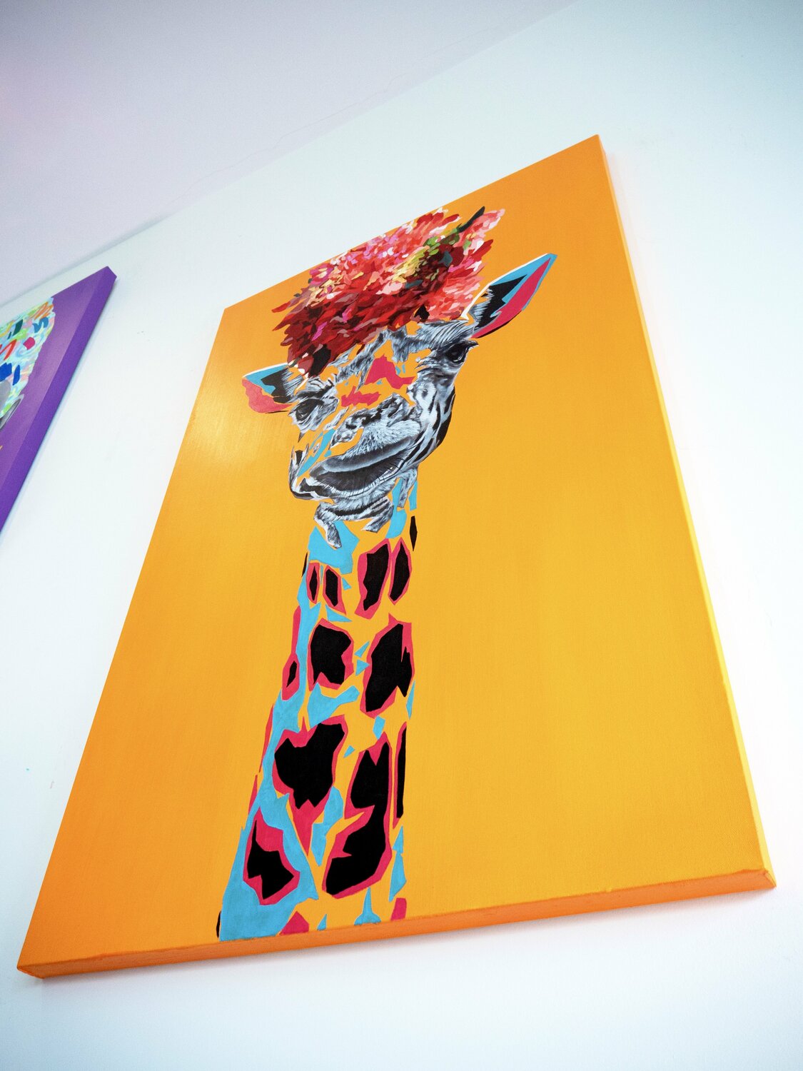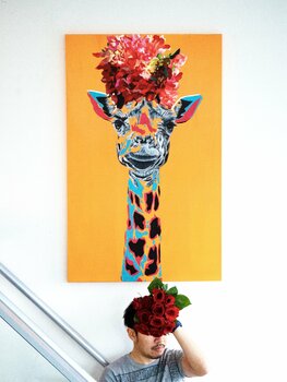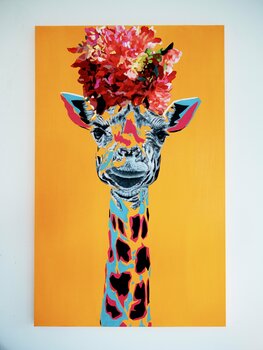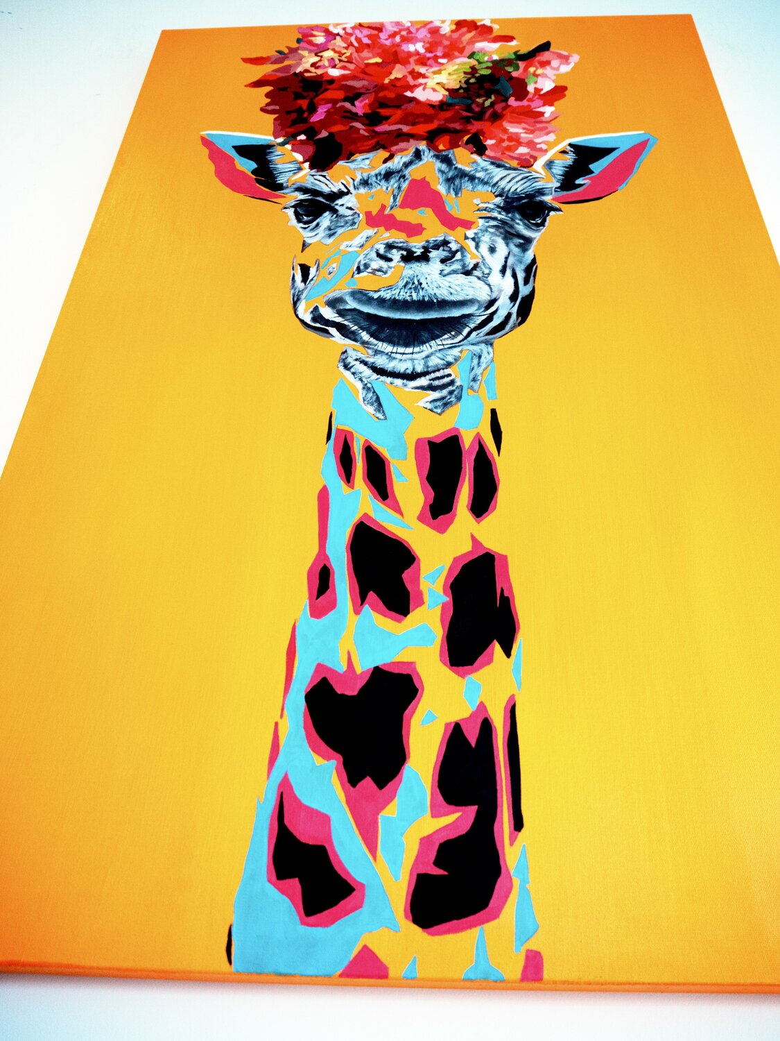 Il collo lungo si adatta a un lungo cappello a fiori. Stile pop e realismo combinati.