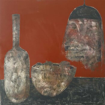 Mele nella ciotola Una giornata così tranquilla e serena.....Una natura morta in cui ho stilizzato le forme usando dei colori caldi. Tessitura densa ottenuta dalla stratificazione della pittura ad olio. Nelle mie nature morte non metto vasi da dipingere, sono fantasie o più precisamente la mia idea di pace in casa
