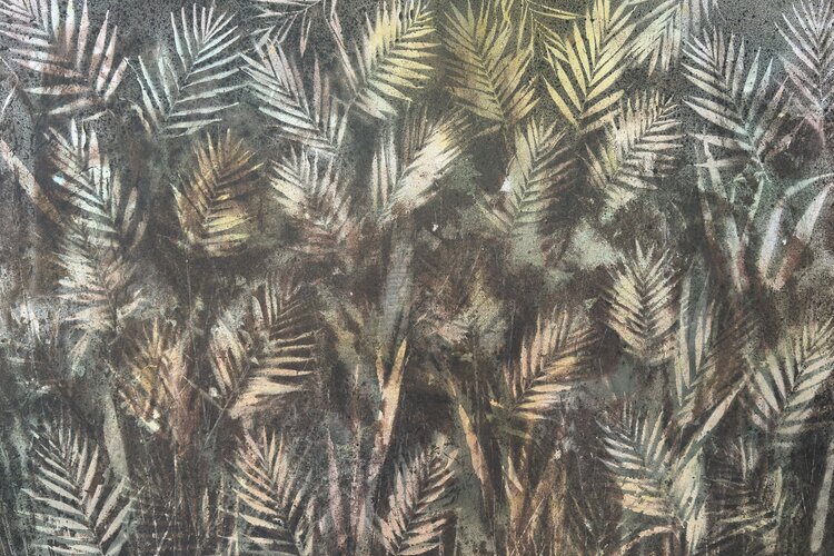 Strati di foglie di palma emergono e scompaiono, come ricordi intrecciati nel tempo.