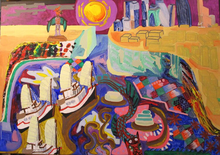 La scena raffigura tre antiche barche da pesca cinesi che tornano al porto. Sullo sfondo è raffigurata una città moderna. Un drago è nel mare e un altro si affaccia su una scogliera.