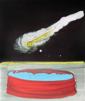 In questo lavoro mescolo dinamiche astratte con elementi figurativi minimi e un pizzico di immagini pop art per rappresentare una scena surreale. Una cometa si dirige verso una piscina colorata, forse a simboleggiare eventi inaspettati e trasformativi nella vita. C'è anche un pizzico di umorismo.