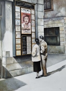In questo lavoro ho permeato l'essenza del tempo fermato, un momento sospeso che invita alla nostalgia. La pittura a olio mi ha permesso di catturare texture e luce, creando un'atmosfera vintage che risuona con le epoche d'oro del cinema. Realismo e arte si fondono, raccontando storie di figure anonime davanti al manifesto, le loro vite intrecciate nel mosaico urbano. Ogni pennellata è un sospiro, un battito del cuore della città che, ora, batterà… forte anche nella vostra casa.