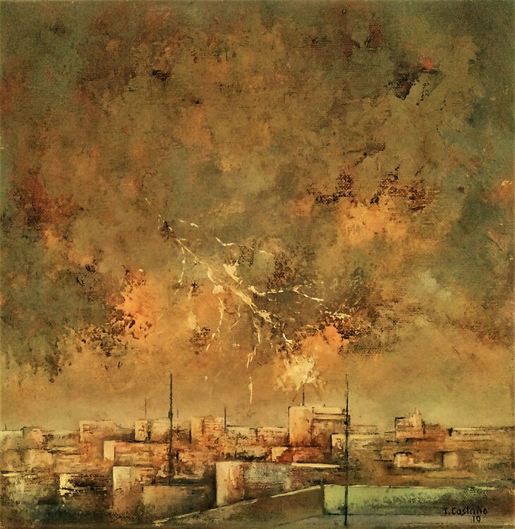 Mi sono ispirato alla dualità tra natura e urbanità, utilizzando la pittura ad olio per catturare la tensione dinamica di un temporale sulla città. Nel mio lavoro, le pennellate grezze e gli strati ricchi di texture ci invitano a riflettere sulla vulnerabilità umana alla forza del clima. I colori della terra e i lampi di luce illustrano la potenza della tempesta, aggiungendo un'atmosfera di intensità emotiva e bellezza selvaggia che risuonerà in… ogni spazio.