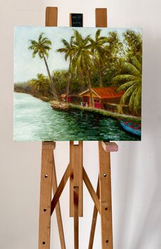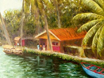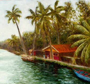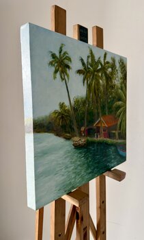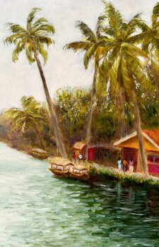 Le lagune di Alleppey presentano innumerevoli sfumature di verde e una profonda quiete quasi meditativa. Questo dipinto cerca di catturare uno scorcio di Alleppey, nel Kerala, nel sud dell'India.
