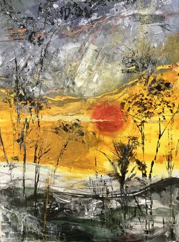 In quest'opera, ho catturato una vibrante atmosfera serale con toni accesi di giallo e rosso, che irradiano calore ed energia. La struttura e le forme astratte incarnano un mix di chiarezza e mistero. Il mio obiettivo era catturare la bellezza di un tramonto, creando al contempo una connessione emotiva più profonda con la natura. Quest'immagine conferisce vivacità e potenza a qualsiasi spazio.