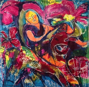 Quest'opera unisce l'arte espressiva e semi-astratta con elementi di pittura naif e simbolismo. La tecnica del batik a caldo esalta l'intensità dei colori e delle linee, creando una composizione vibrante e vivace.