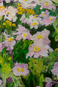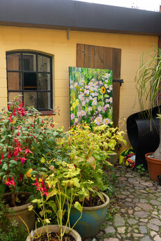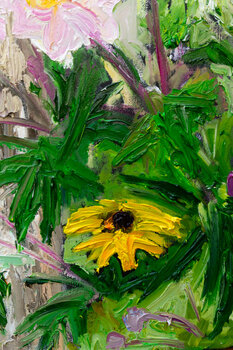 Questa foto è stata scattata nel mio giardino all'inizio di agosto. Mi è piaciuto il singolo girasole luminoso con i suoi petali leggermente mossi dal vento. Si distingue dal mare rosa degli anemoni. I delicati fiori blu della cicoria si possono vedere in alto a sinistra dell'immagine. Il giallo chiaro e freddo delle enotera è accompagnato dai toni gialli caldi e vibranti degli echinacee in primo piano. I colori sono applicati in modo denso sulla… tela nera. Le texture creano interessanti ombre tridimensionali. I bordi sono neri. Il quadro può essere appeso senza cornice. Un cavo d'acciaio garantisce una sospensione sicura. La mia firma è sul davanti.