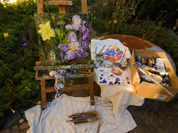 Questa foto è stata scattata nel mio giardino in una calda giornata autunnale. Mi è piaciuto il contrasto cromatico tra il delicato croco viola e l'enotera giallo brillante. Ho applicato i colori ad olio in modo espressivo e con una forte applicazione di vernice. Ciò conferisce all'immagine una plasticità speciale. L'immagine irradia vivacità e freschezza. I bordi del supporto del quadro, che è in legno, sono verniciati. Un cavo d'acciaio fornisce… la sospensione. La mia firma è sul davanti.