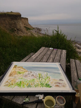 Ho dipinto questo acquerello in una giornata nuvolosa e nebbiosa d'estate sull'isola danese di Ærø nel Mar Baltico. L'aria umida ha consentito transizioni di colore morbide e fluide che hanno conferito all'immagine un'espressione di trasparenza e delicatezza. Il verde fresco della vegetazione risplende contro il grigio caldo del cielo. La carta fatta a mano da 300 g di Centenaire è servita come superficie pittorica. Il quadro è fissato su cartoncino… passe-partout grigio di dimensioni 60x80 cm. La mia firma è sul davanti.