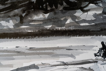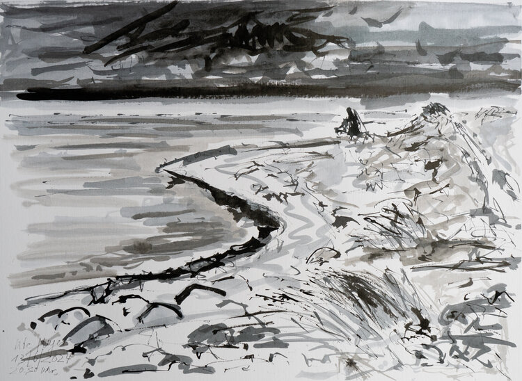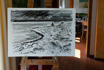 Soffiava un fresco vento estivo quando ho creato questo disegno a penna monocromatico e ho dovuto vestirmi in modo caldo. Ho catturato questa atmosfera meteorologica in riva al mare espressamente con una piuma di bambù e un pennello. Utilizzo tratti dinamici e fluidi toni di grigio per mostrare la bellezza e la vastità del paesaggio costiero. Il portafoto è un robusto cartoncino passe-partout. La mia firma è sul davanti.