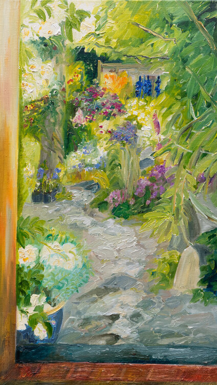 Questa foto è stata scattata a giugno nella mia cucina. Mostra una vista del giardino. I rigogliosi fiori bianco crema della rosa rampicante Bobby James possono essere visti sul bordo sinistro dell'immagine. La rosa è alla porta. La vista va sul giardino. Lungo un sentiero, daylilies arancioni, delphinium blu scuro, digitali digitali rosa tenue, ninfee bianche, azzurre e magenta fioriscono su un letto di piante perenni. L'immagine mostra una tranquilla… e soleggiata giornata estiva. La tela è tesa a mano, innescata quattro volte e dotata di filo di acciaio per appenderla. I bordi sono dipinti. L'immagine può essere appesa direttamente. La mia firma è sul davanti.