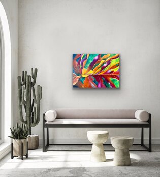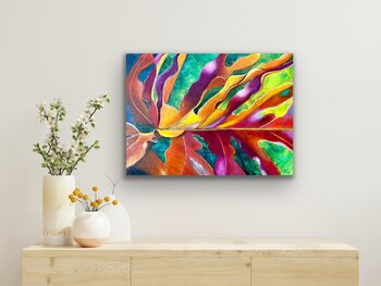 Ho usato l'acrilico mescolato con un medium altamente trasparente per esaltare le proprietà di luce e ombra di questa foglia di filodendro. Linee che salgono, scendono e si intrecciano. Una danza di movimento che brilla di luce e colore.