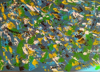 Quest'opera astratta di grandi dimensioni è una composizione esplosiva di colori acrilici vibranti. La tela è dominata da un blu profondo e saturo, che funge da sfondo rilassante per un gioco dinamico di pennellate gestuali. Verdi e gialli emergono energicamente, creando l'impressione di una forza vibrante, quasi vegetale, forse un ecosistema caotico o una travolgente fioritura primaverile. Accenti bianchi forniscono riflessi di luce e texture, mentre… tocchi di nero e fini particelle di glitter aggiungono ulteriore contrasto e profondità. Il dipinto è un'espressione di pura energia e movimento, un'eco visiva della vita moderna, dove il caos apparente si fonde in un insieme accattivante e armonioso.
