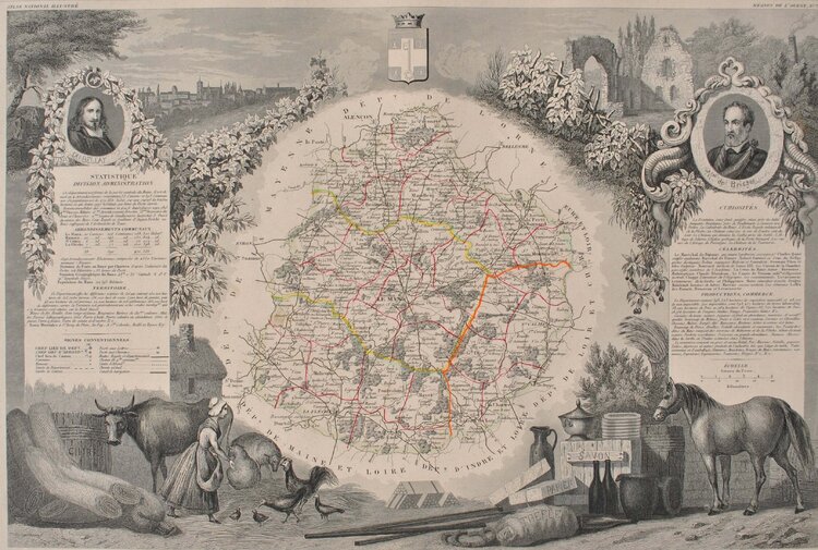 INFORMAZIONI: Superba incisione d'epoca stampata nel 1846 nello studio Combette di Parigi. Le illustrazioni dei luoghi e delle tradizioni del dipartimento attorno alla mappa sono state realizzate dal pittore Raymond Bonheur, padre della… pittrice e scultrice Rosa Bonheur.