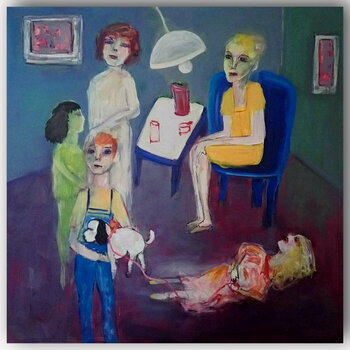 In questo dipinto, colori vivaci si mescolano a contorni sfumati, creando uno spazio in cui si incontrano figure e aree più astratte. L'interazione dei personaggi evoca una storia abbastanza banale dove il bambino, steso a terra, esprime la sua rabbia per non avere il cagnolino.