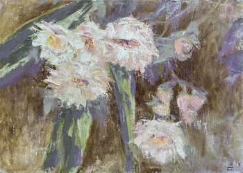 Quest'opera raffigura un ramo di eucalipto fiorito, realizzato con una tecnica pittorica pastosa. La consistenza e i contrasti cromatici enfatizzano la tenerezza e la raffinatezza dei fiori. I petali sembrano brillare con tenui tonalità pastello di rosa e bianco, creando una sensazione di fragilità. Lo sfondo del dipinto è caratterizzato da una complessa combinazione di colori con tonalità dominanti di marrone e verde, che completano armoniosamente… il motivo centrale.