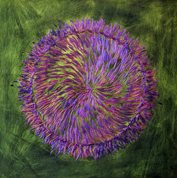 In quest'opera, ho creato una vibrante implosione di colori utilizzando acrilici e pigmenti, che simboleggiano energia e crescita. L'interazione astratta di viola e verde mira a trasmettere… speranza e dinamismo. Entrambi sono urgentemente necessari in questo momento.