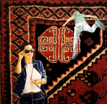 In questo lavoro ho voluto catturare un incontro sospeso tra realtà e fantasia, fondendo il collage con la pittura figurativa. La figura femminile emana sicurezza e spensieratezza, mentre il personaggio che sembra librarsi sfida la gravità, creando un contrasto dinamico. I colori caldi e profondi del tappeto donano energia e un senso di radicamento, trasformando l’opera in un invito a volare pur con i piedi ben piantati a terra.