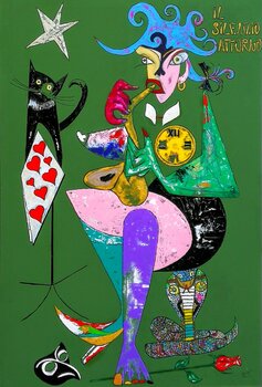 Nella mia opera "Il Silenzio Attorno," ho esplorato il tema del silenzio interiore e della contemplazione attraverso la vivacità e la complessità. Le figure surreali e gli elementi simbolici, come il gatto nero e l'orologio, rappresentano i diversi aspetti della mente umana che si confrontano con il tempo e le emozioni non dette. I colori accesi e il dinamico stile figurativo invitano a una riflessione profonda, pur essendo esteticamente stimolanti.… Portando questo quadro nella tua casa, aggiungerai un tocco di mistero e un'energia vibrante che stimola la mente a ogni sguardo.