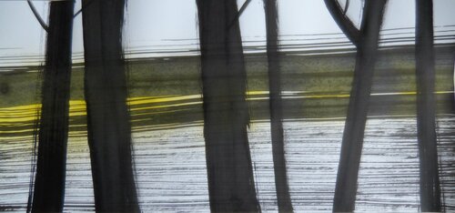 Il disegno combina inchiostro nero e giallo su carta. Fa parte della serie "Orizzonte emotivo".
