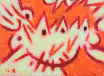 Rappresenta in modo astratto dei giovani uccelli in un nido, mentre vengono nutriti dalla madre. Semplificando le forme con linee e punti decisi, ho cercato di trasmettere vividamente la vitalità della natura in quel momento.