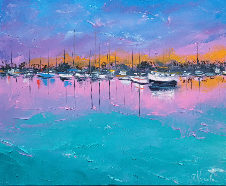 Quest'opera riflette sulla soglia tra il paesaggio esterno e lo stato emotivo interiore. Le barche e l'orizzonte si dissolvono in un campo astratto di colore e luce, diventando una metafora della quiete. Il tramonto non è qui semplicemente un fenomeno naturale, ma un momento di pausa interiore, quando il rumore del giorno cede il passo alla contemplazione. Il dipinto invita lo spettatore a rallentare ed entrare in uno spazio… di silenzio, dove la forma cede il passo al sentimento.