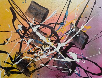In quest'opera ho catturato la mia energia e la mia libertà attraverso schizzi audaci e forme dinamiche. La combinazione di acrilico e vernice crea una texture vibrante che trasmette allo spettatore un senso di vivace movimento. L'intento è quello di risvegliare l'amore per l'imperfezione e un'energia gioiosa in qualsiasi ambiente.