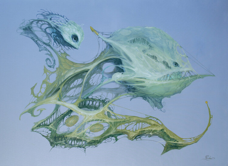 에드 샤프는 독학으로 그림을 익힌 화가로, 주로 유화를 사용하여 아카데미 수업을 추가로 수강하며 기량을 갈고닦았습니다. 그는 즉흥적인 붓놀림, 습식 기법, 그리고 겹겹이 쌓인 질감을 능숙하게 활용하여 기억과 상상력이 뒤섞인 초현실적이고 환상적인 존재들을 그려냅니다. 그의 스타일은 추상적인 생명체를 몽환적인 형태로 발전시켜, 변화와 모호한 자유라는 주제를 구현합니다. 그의 작품에 담긴 감정적인 분위기는 강렬하게 환기시킵니다. 장난기 넘치고 상상력이 풍부하면서도 꿈의 신비로운 긴장감이 물씬 풍기며, 보는 이를 아름다움, 기묘함, 그리고 카타르시스적인 불안감 속으로 부드럽게 안내합니다.