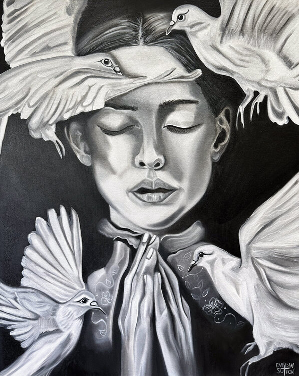 에블린 서튼은 수십 년간 그래픽 디자인 분야에서 쌓아온 경험과 색채, 자연, 신앙에 뿌리를 둔 풍부한 유산을 바탕으로 활동하는 브라질계 미국인 유화 화가입니다. 사실주의와 현대적 상징주의를 절묘하게 조화시켜, 빛나는 유약을 겹겹이 바르고 빛과 그림자, 그리고 미니멀한 배경의 강렬한 대비를 통해 시대를 초월하면서도 현대적인 효과를 연출합니다. 그녀의 풍부한 상상력을 자극하는 작품은 아름다움, 회복력, 그리고 영적인 희망을 담아내며, 보는 이를 신성과의 사색적인 연결고리로 초대하고 영혼을 고양시킵니다.