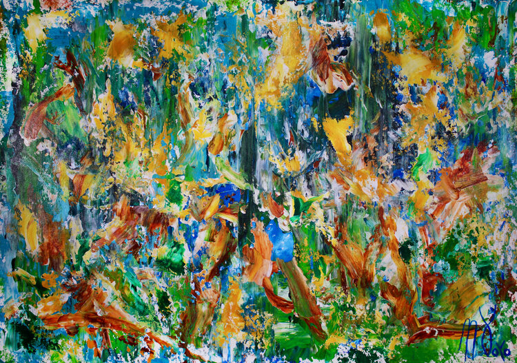 이 작품은 특히 선명하고 대담한 녹색과 노란색의 대비에 관한 것입니다. 팔레트 나이프를 사용하여 페인트와 매체를 성형하는 동안 모든 유기적 움직임으로 채워진 모양이 레이어별로 만들어졌습니다. 연한 녹색에서 짙은 녹색까지 다양한 녹색 음영이 각 레이어에 흰색, 인도 노란색 및 파란색과 혼합되어 이 그림을 에너지로 가득 찬 구성으로 만들고 훌륭한 방의 문장을 의미합니다!