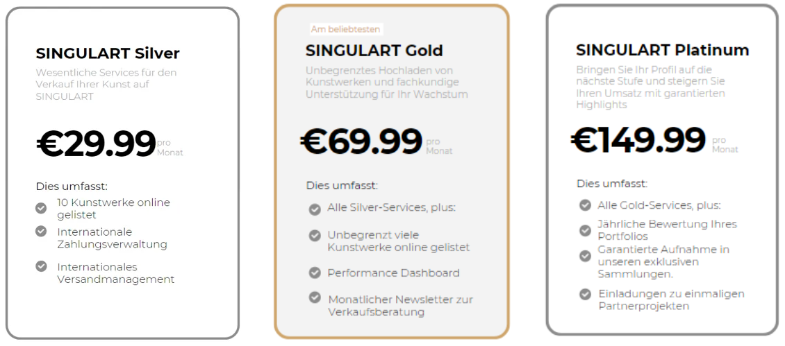 Der Silver-Plan soll Ihnen helfen, mit dem weltweiten Verkauf von Kunstwerken zu beginnen. Als Silver-Mitglied können Sie insgesamt 10 Kunstwerke hochladen. Sobald diese Kunstwerke verkauft sind, können Sie keine weiteren Kunstwerke hinzufügen.