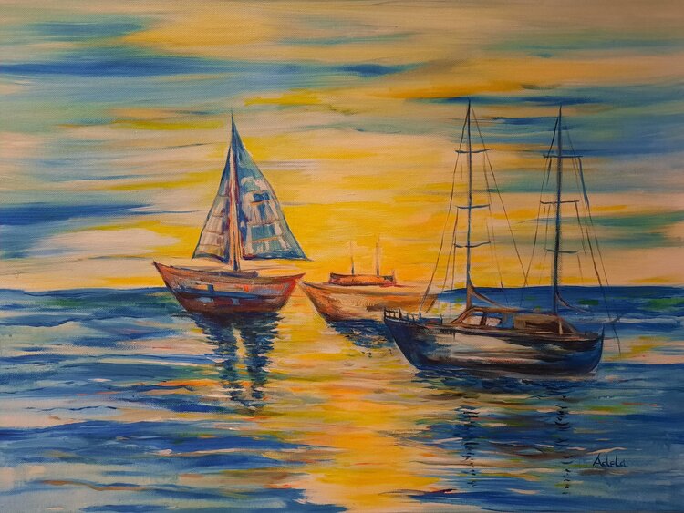 Ik schilderde dit tafereel om de vredige dans van boten bij zonsondergang vast te leggen. Met levendige acrylverf heb ik elke penseelstreek met emotie gevuld, waarbij ik warme en koele tinten vermengde om rust en hoop op te roepen. Dit werk straalt een kalmerende, stralende energie uit en nodigt je uit om weg te dromen in kalme wateren, elke keer dat je ernaar kijkt.
