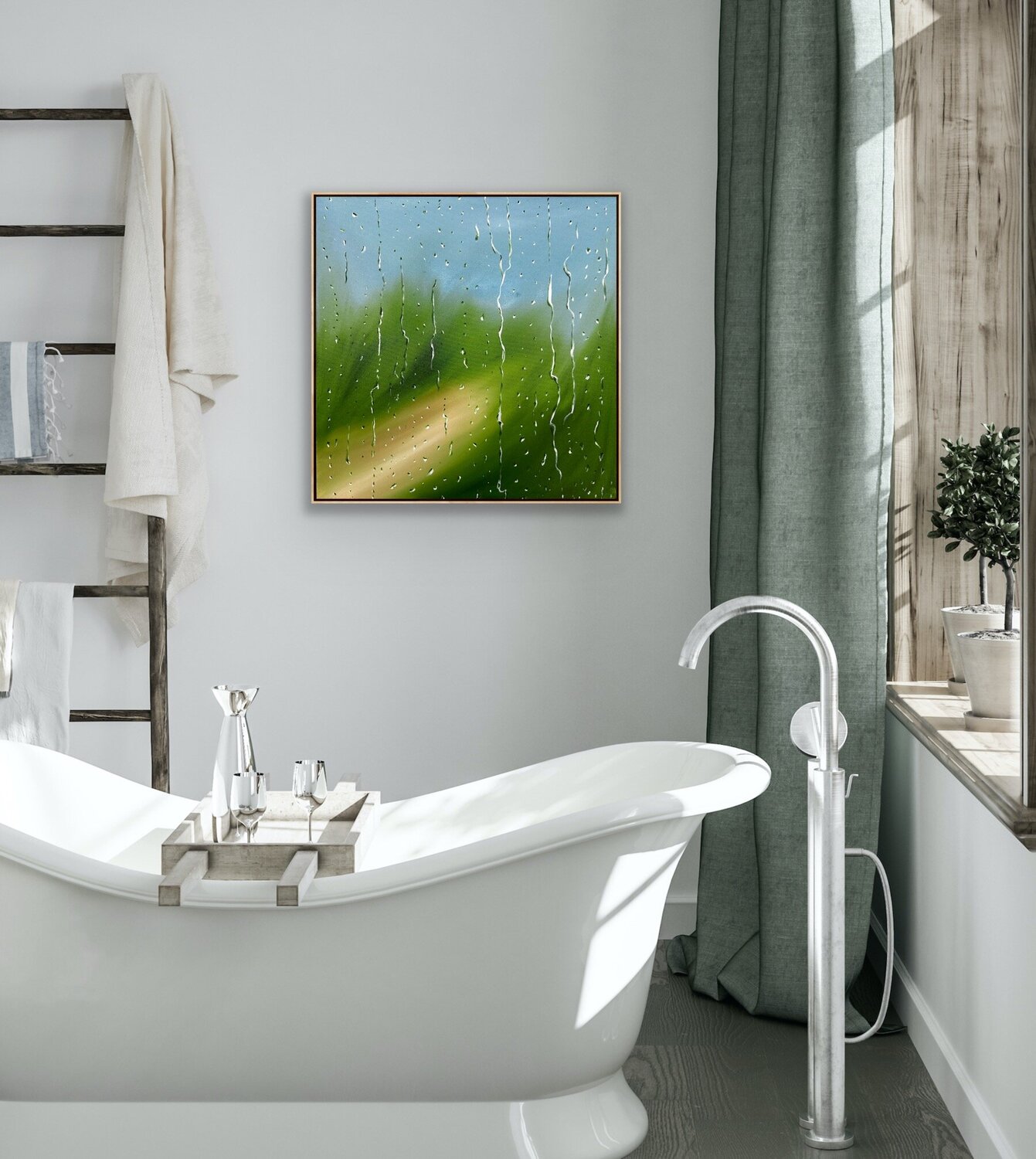 Ik hoop dat dit regenlandschap een gevoel van rust in uw ruimte brengt, terwijl u het licht en het water op het canvas ziet spelen.