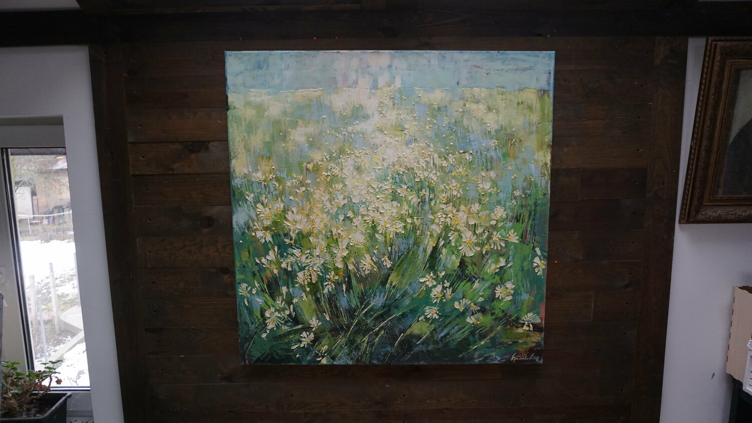 Kunstwerk op houten raamwerk. Klaar om op te hangen. Omlijsten op aanvraag.