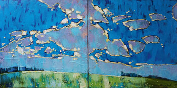 Veel lucht, weinig land. Opengewerkte, kanten wolken zweven langs de blauwe lucht. Kleuren van geluk, kleuren… van vrede, kleuren van de zomer. Expressieve paletmesstreken, dynamische compositie. Modern schilderij voor een modern interieur.